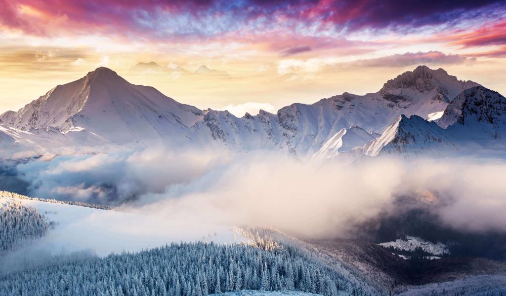 Обои Туман над лесом у заснеженных гор зимой