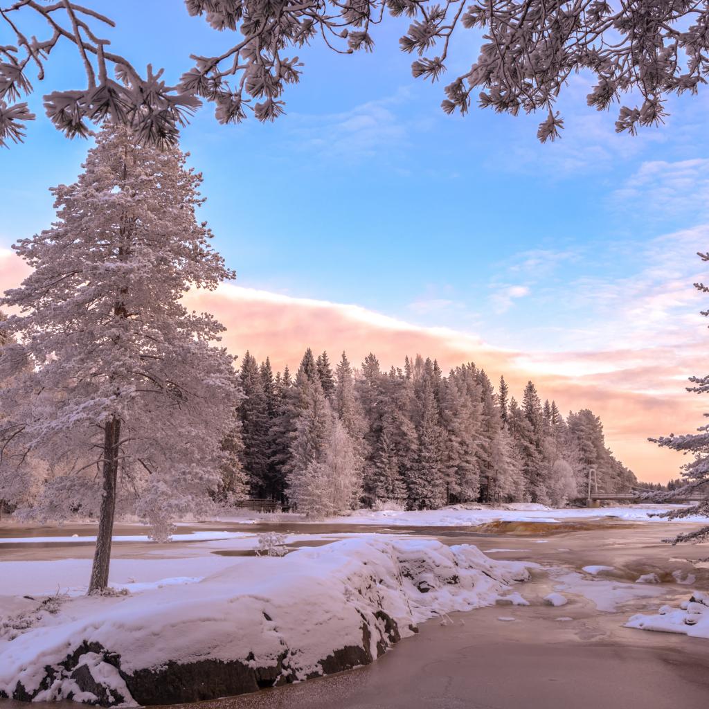 Обои Красивые покрытые инеем деревья у реки под голубым небом зимой