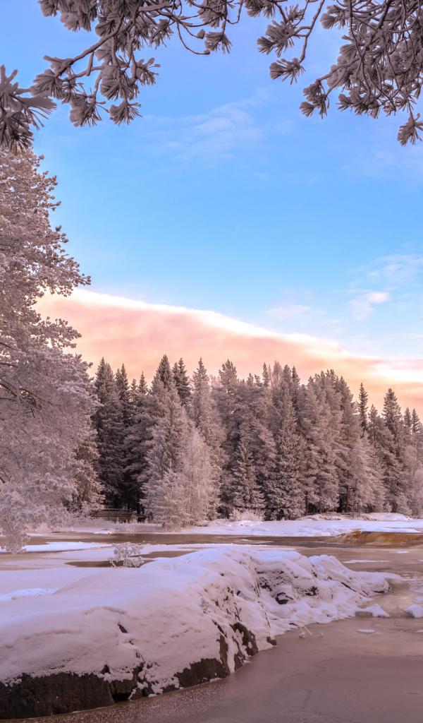 Обои Красивые покрытые инеем деревья у реки под голубым небом зимой