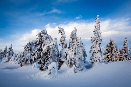 Обои Красивый высокие ели в заснеженном лесу зимой под голубым небом