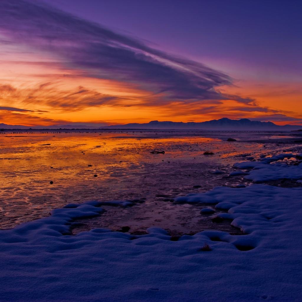 Обои Заснеженный берег на озере под красивым небом на закате