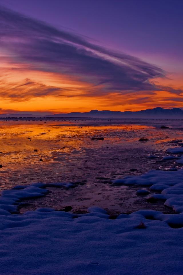 Обои Заснеженный берег на озере под красивым небом на закате