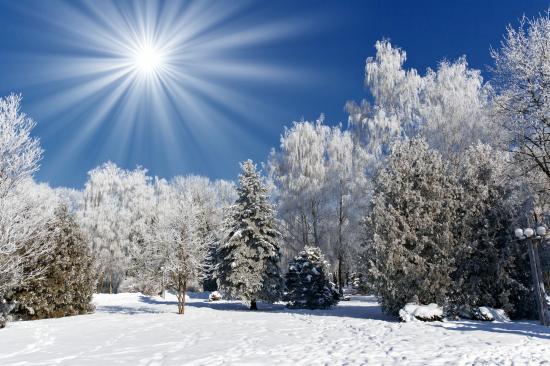 Обои Яркое зимнее солнце над заснеженным лесом