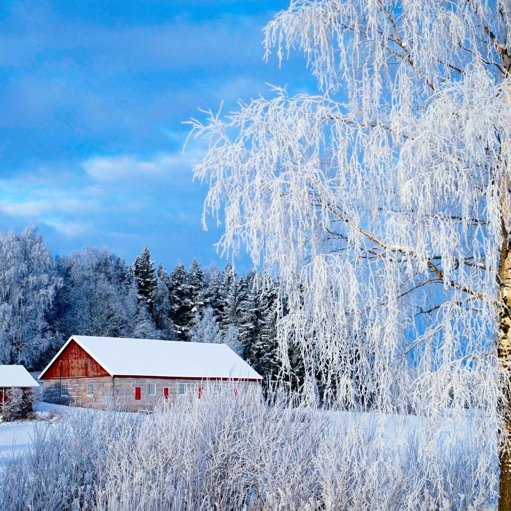 Обои Красивые покрытые белым инеем деревья на фоне голубого неба зимой