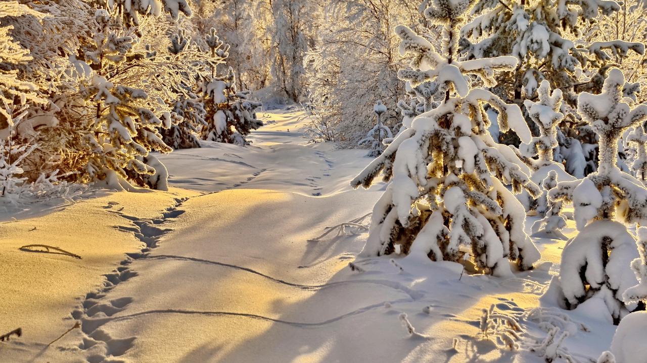 Обои Следы животных на снегу в заснеженном солнечном зимнем лесу