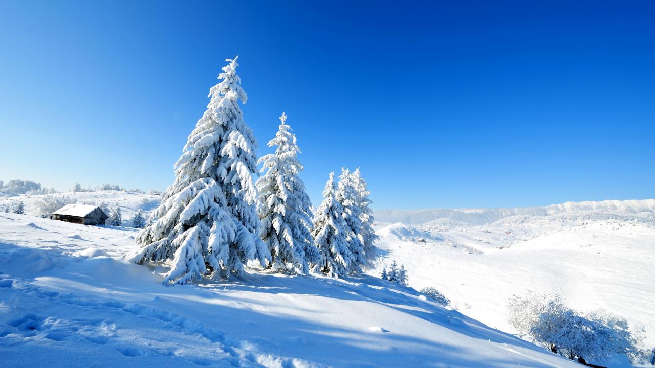 Обои Заснеженные ели на склоне горы под голубым небом