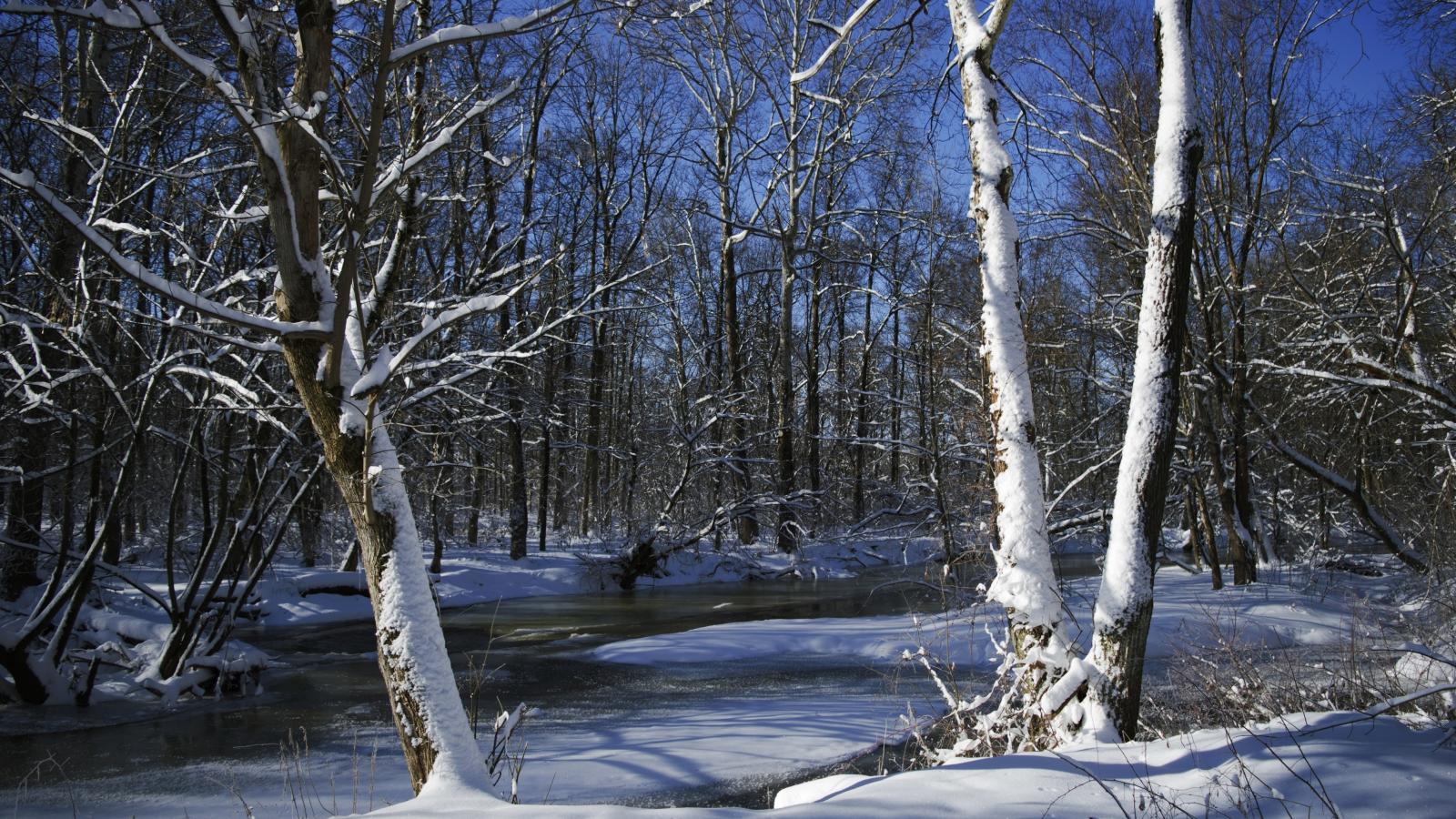Обои Покрытая льдом река в лесу у заснеженных деревьев зимой