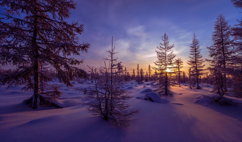 Обои Покрытые снегом если на закате солнца под голубым небом зимой