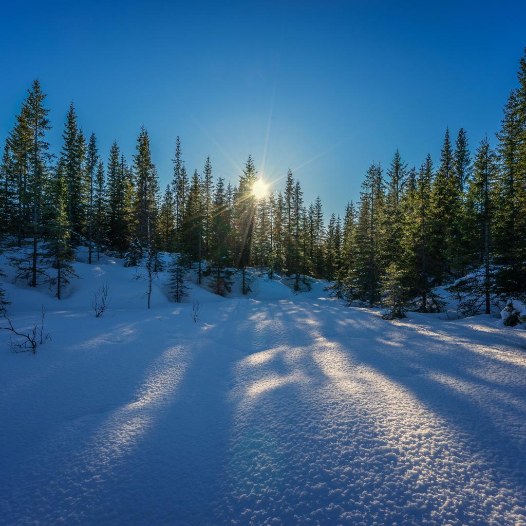 Обои Солнце пробивается сквозь зеленые ели в лесу зимой
