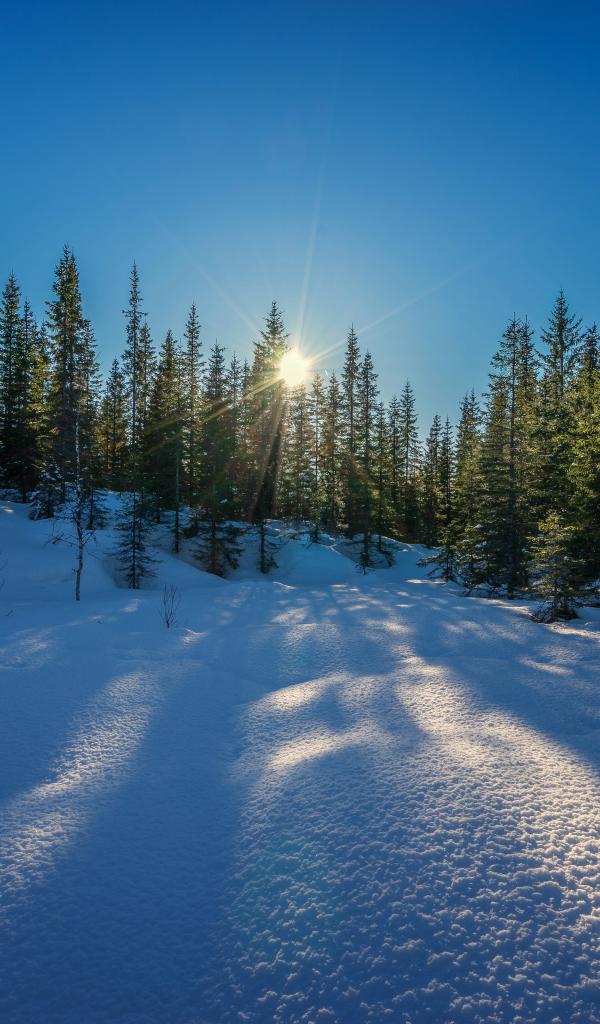 Обои Солнце пробивается сквозь зеленые ели в лесу зимой