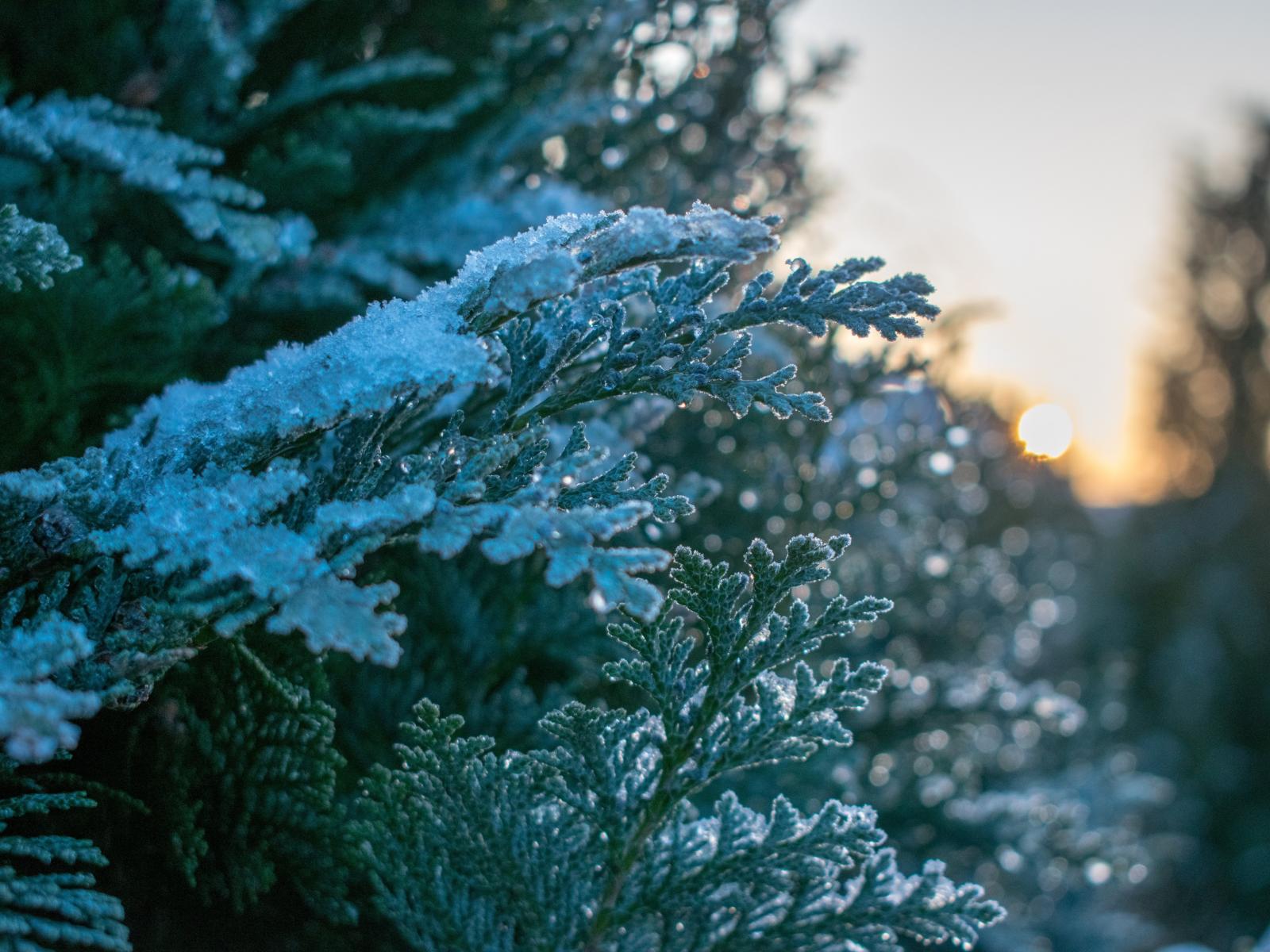 Обои Зеленая ветка туи покрыта снегом