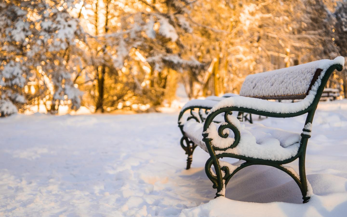 Обои Железная заснеженная лавка солнечным днем