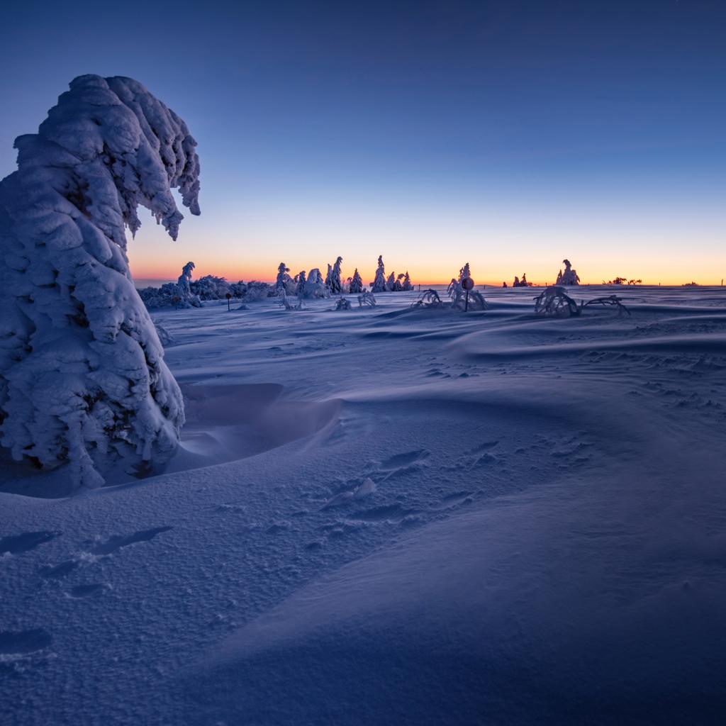Обои Красивые заснеженные деревья на фоне голубого неба на рассвете
