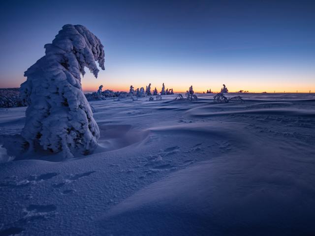 Обои Красивые заснеженные деревья на фоне голубого неба на рассвете