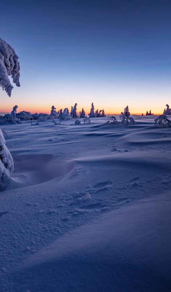 Обои Красивые заснеженные деревья на фоне голубого неба на рассвете