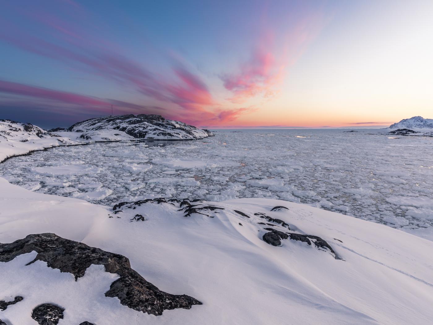 Обои Заледеневшее море с покрытыми снегом скалистыми берегами