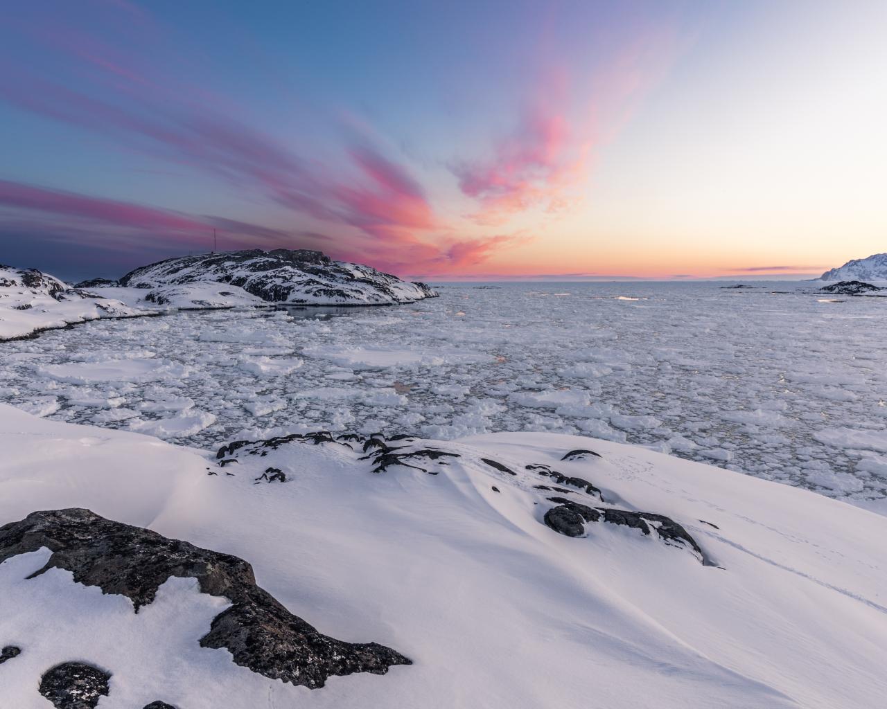 Обои Заледеневшее море с покрытыми снегом скалистыми берегами
