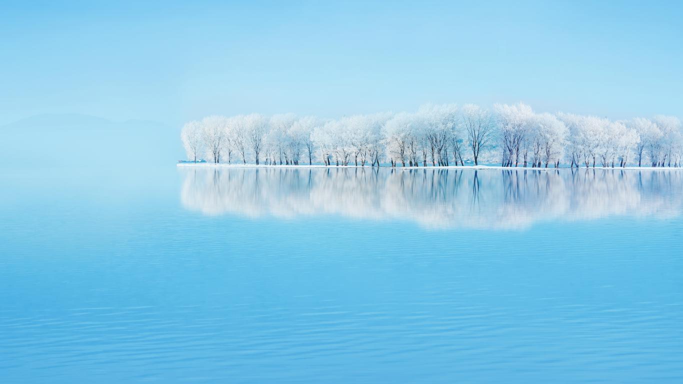 » Обои Покрытые инеем деревья на берегу покрытого льдом озера зимой