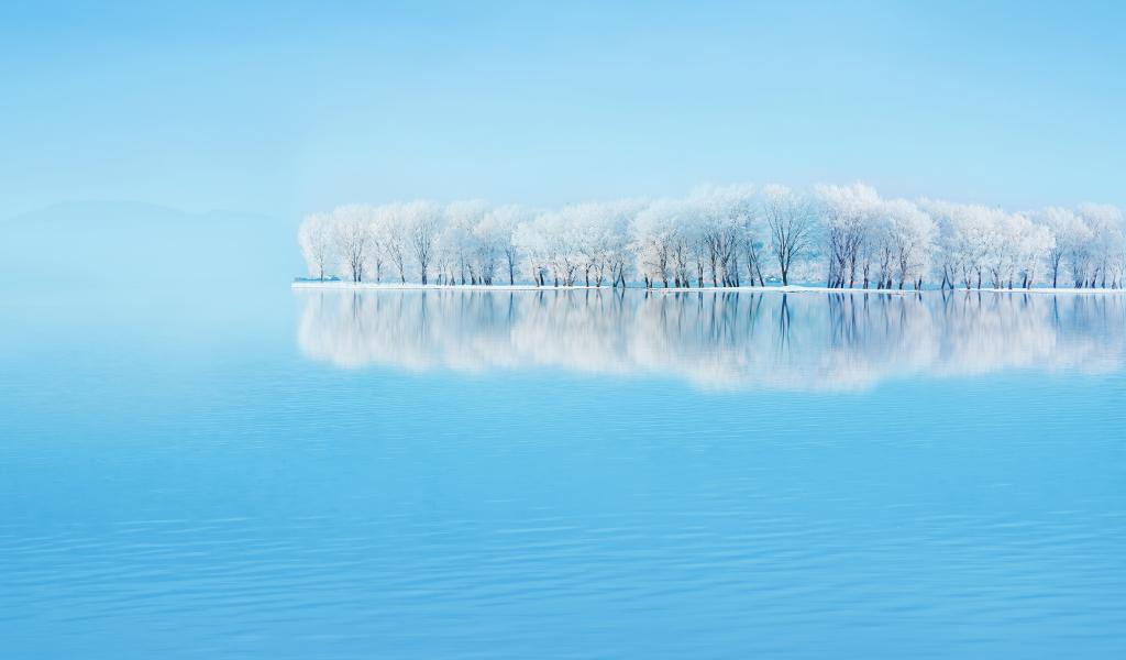 Обои Деревья, покрытые инеем на островке среди озера