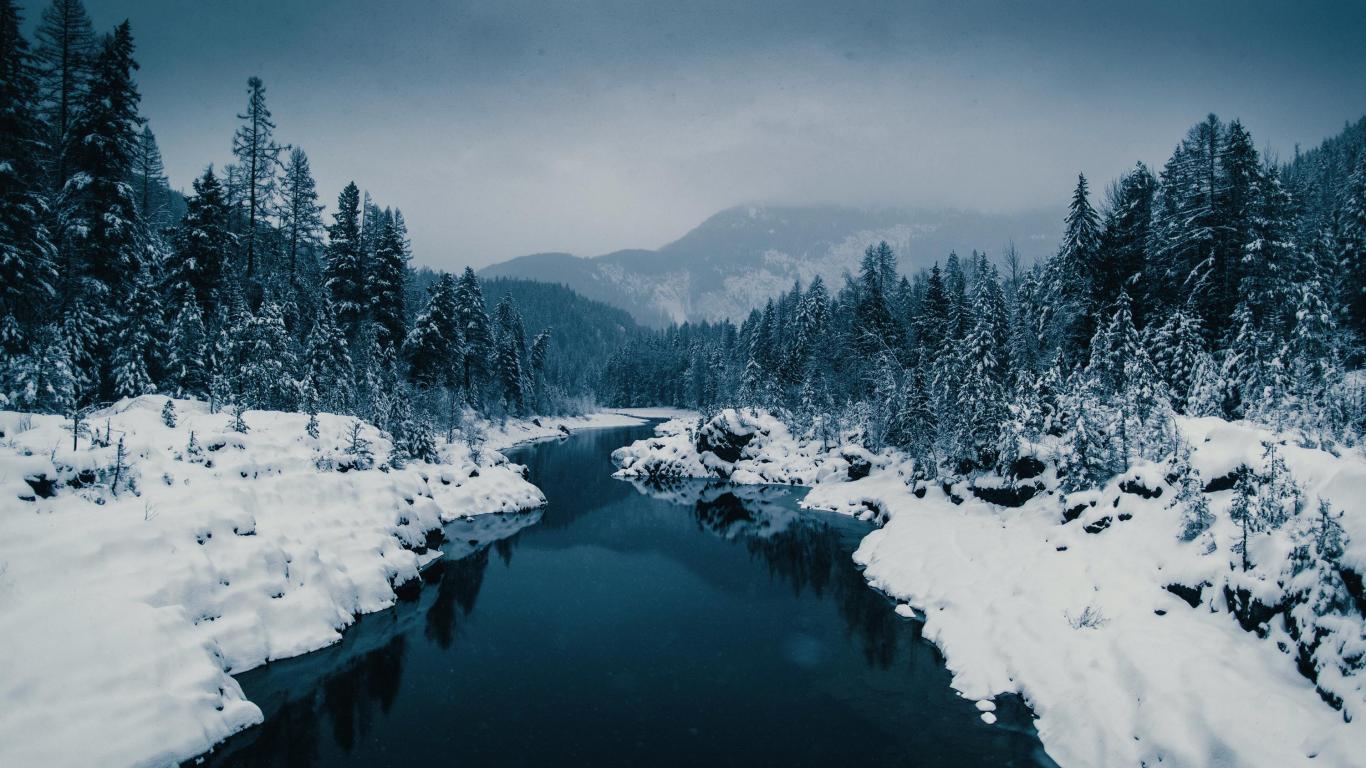 Обои Холодная зимняя река с заснеженными берегами у леса