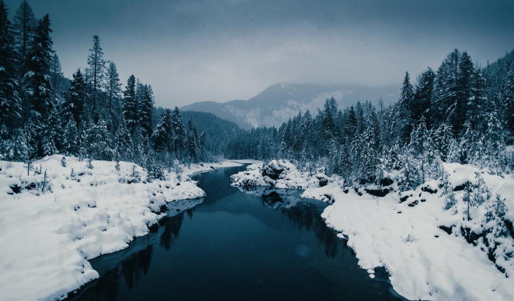 Обои Холодная зимняя река с заснеженными берегами у леса