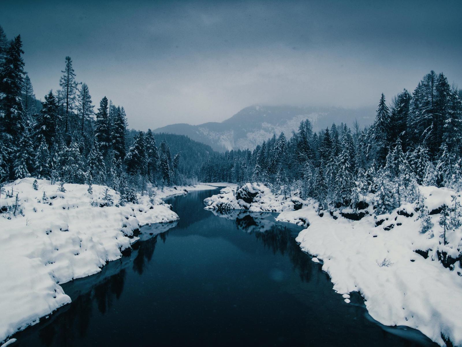 Обои Холодная зимняя река с заснеженными берегами у леса