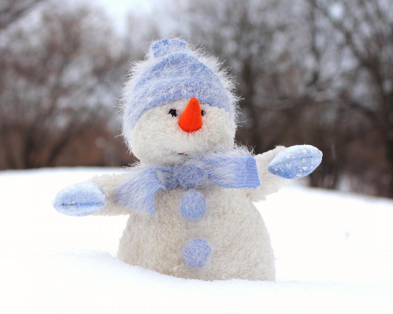 Обои Игрушка снеговик в синей шапке на снегу зимой