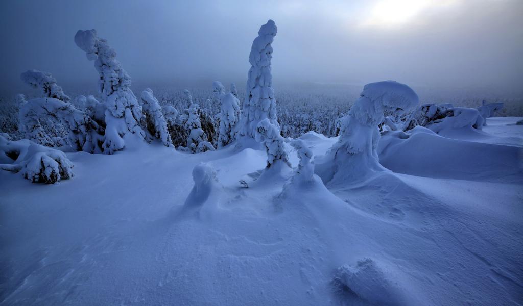 Обои Холодные покрытые белым снегом деревья зимой