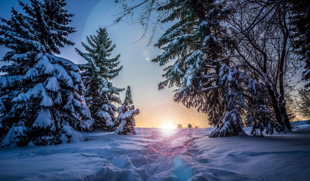 Обои Следы на снегу в заснеженном лесу на рассвете