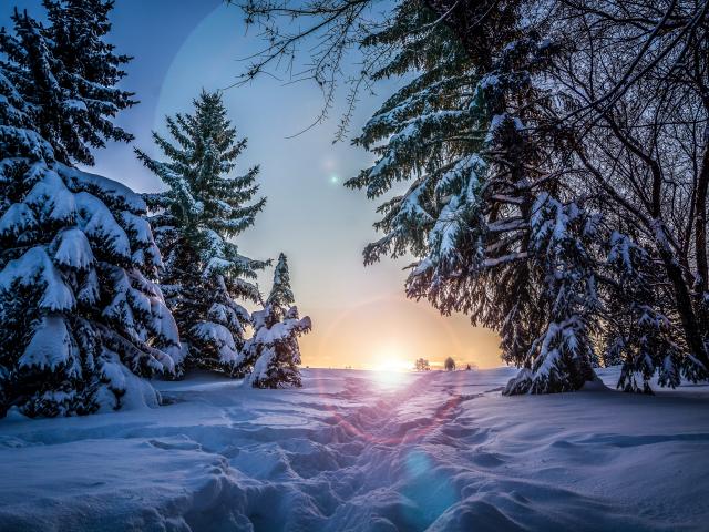 Обои Следы на снегу в заснеженном лесу на рассвете