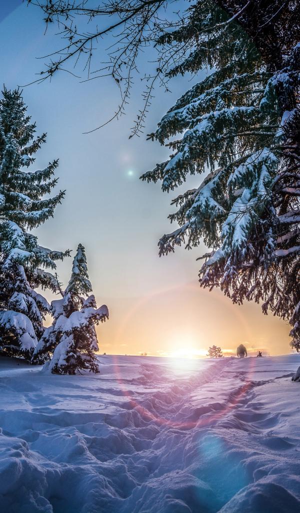 Обои Следы на снегу в заснеженном лесу на рассвете