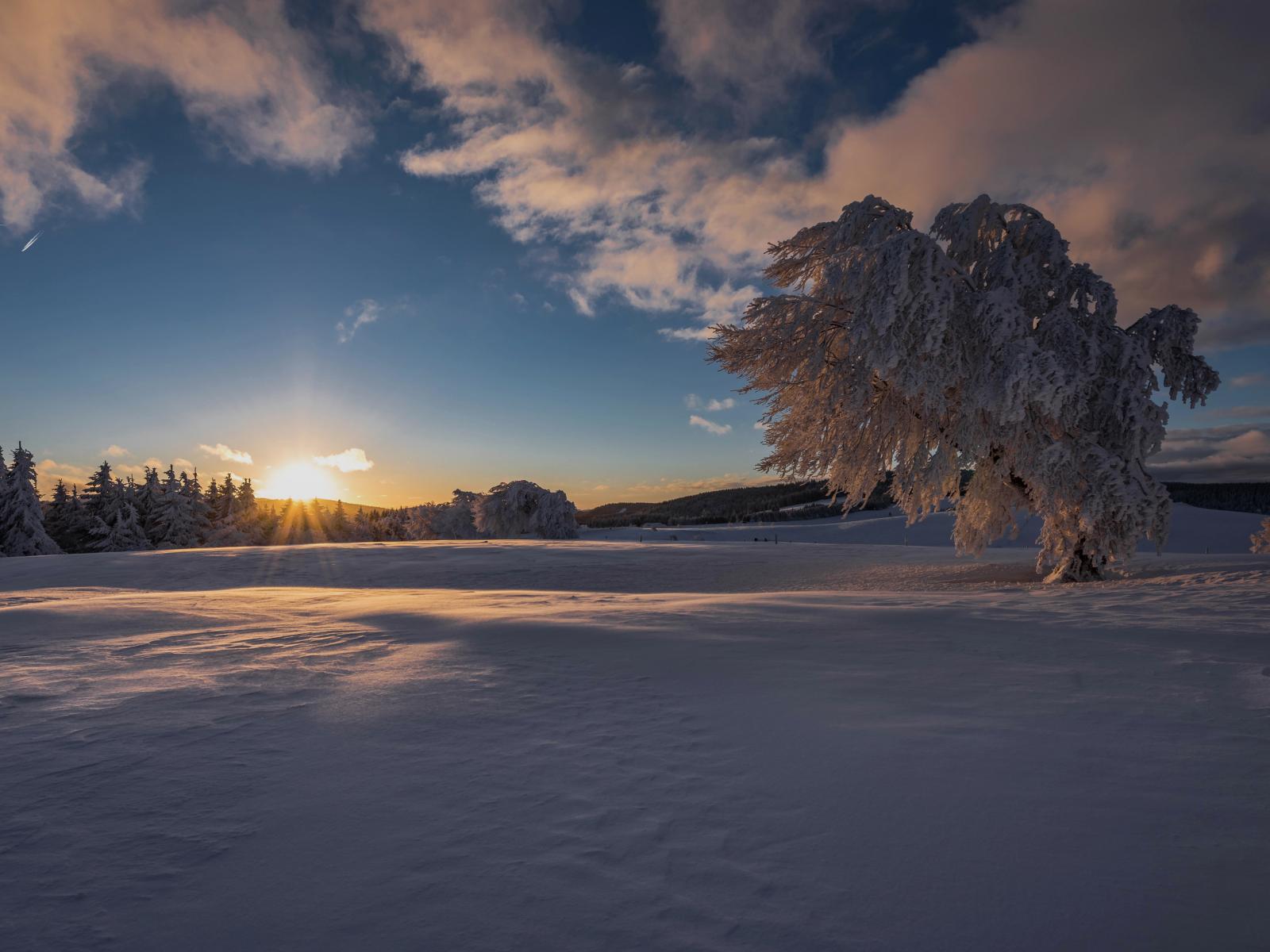 Обои Дерево покрыто инеем на рассвете солнца в лесу