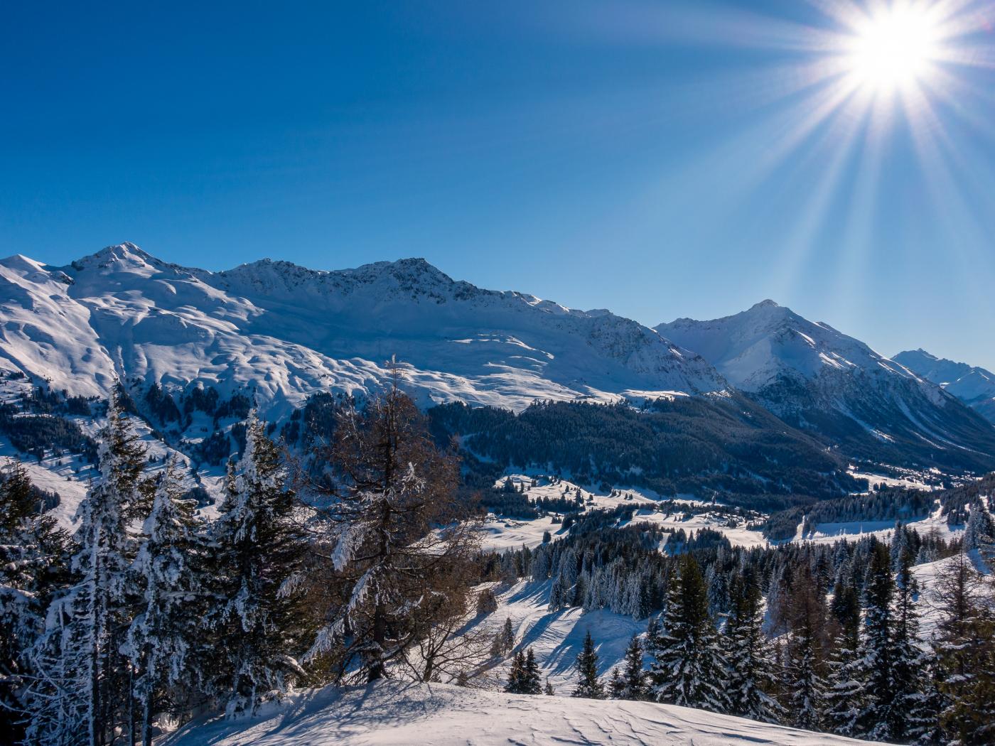 Обои Заснеженный лес в горах в лучах яркого зимнего солнца