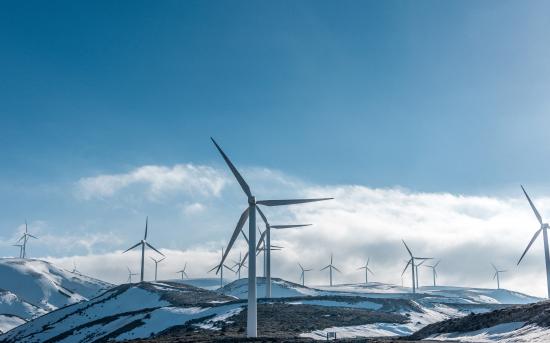 Обои Большие ветротурбины на заснеженных склонах