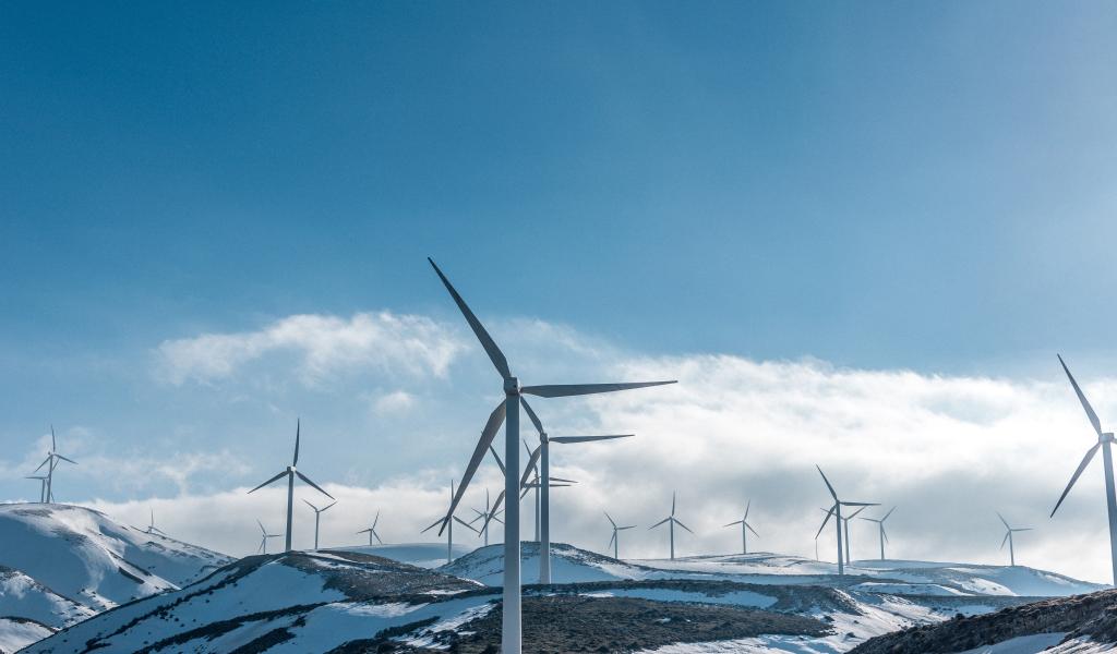 Обои Большие ветротурбины на заснеженных склонах