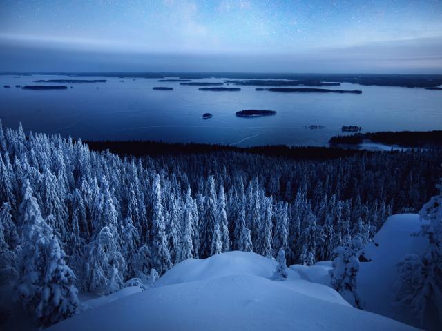 Обои Вид на заснеженный лес у покрытой льдом реки зимой