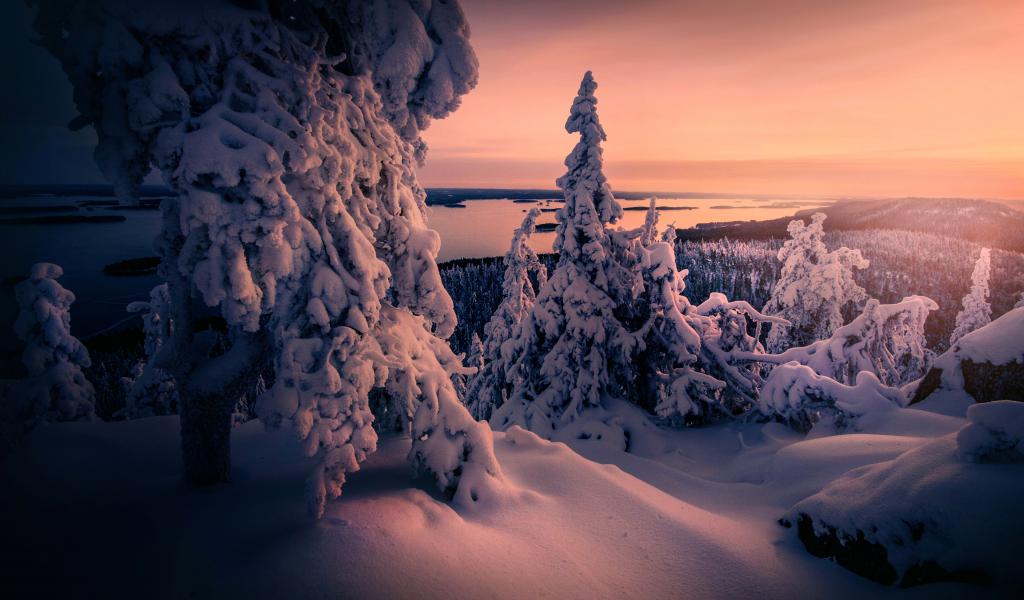 Обои Заснеженные ели в зимнем лесу на фоне неба на закате