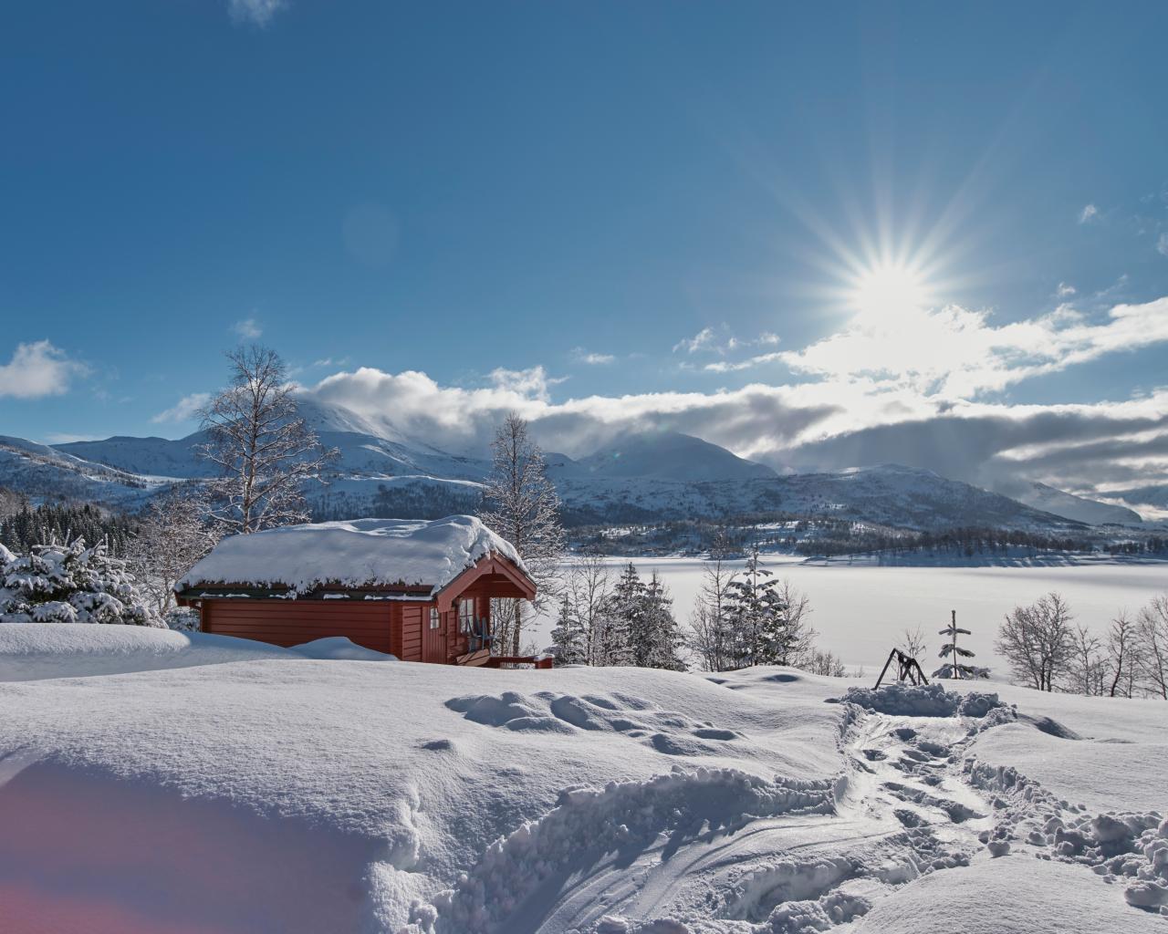 Обои Яркое зимнее солнце у заснеженных гор, Норвегия