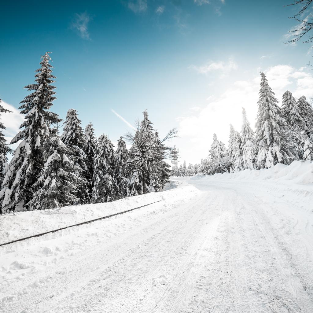 Обои Заснеженная дорога в хвойном лесу зимой
