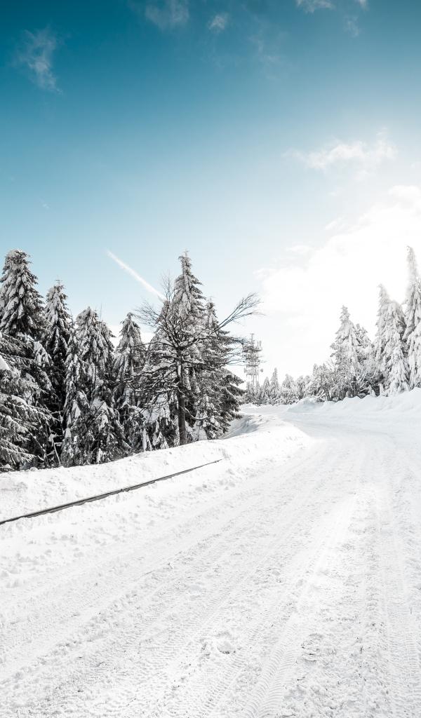 Обои Заснеженная дорога в хвойном лесу зимой