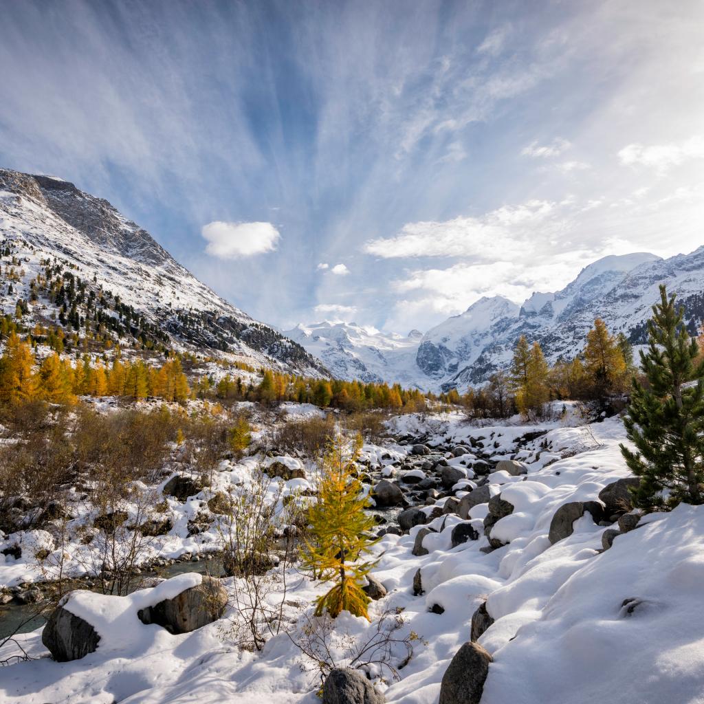 Обои Вид на заснеженные швейцарские горы в лучах солнца