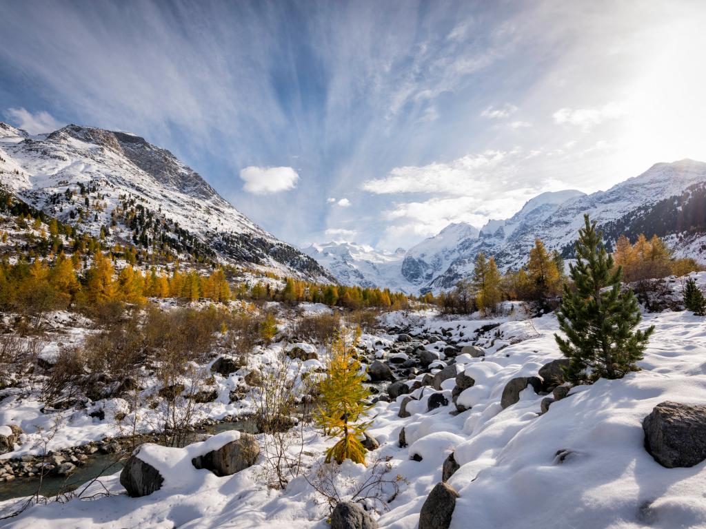 Обои Вид на заснеженные швейцарские горы в лучах солнца