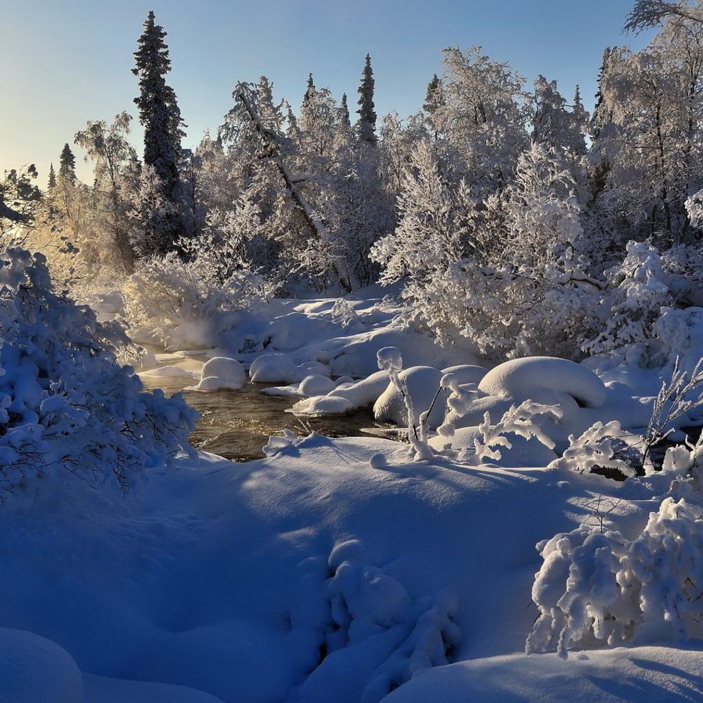Обои Морозное утро в заснеженном лесу у реки зимой