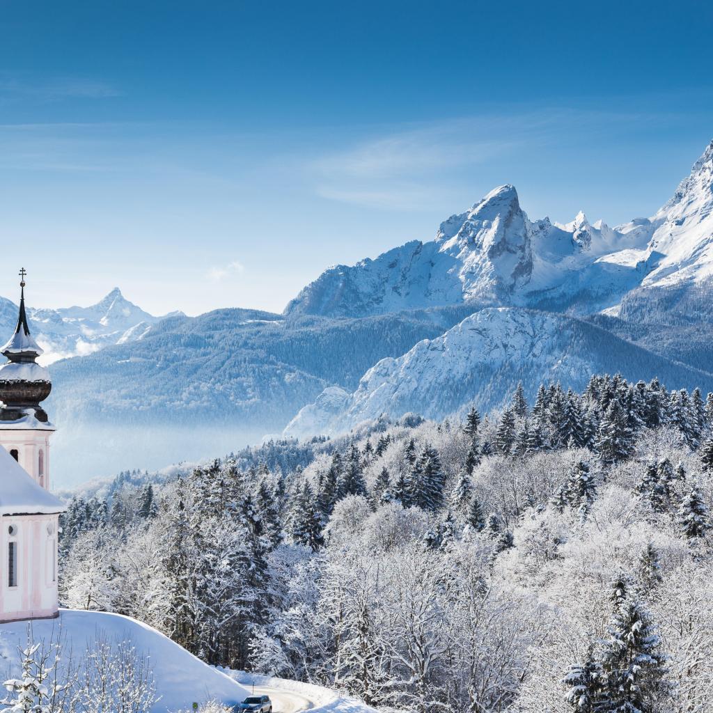 Обои Храм у леса на фоне заснеженных гор