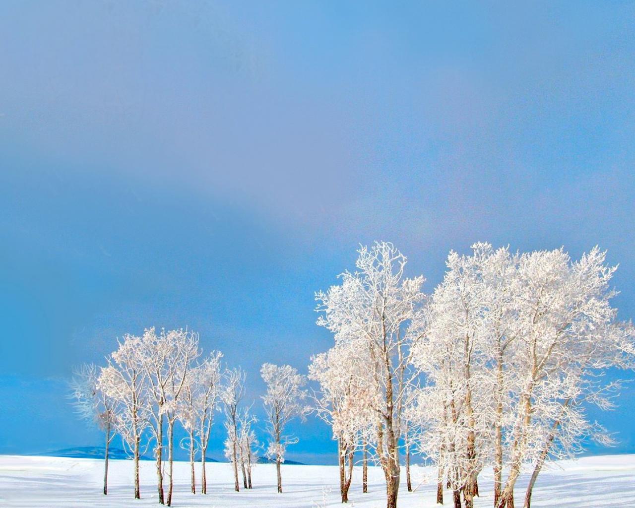 Обои Покрытые снегом деревья на фоне голубого неба зимой