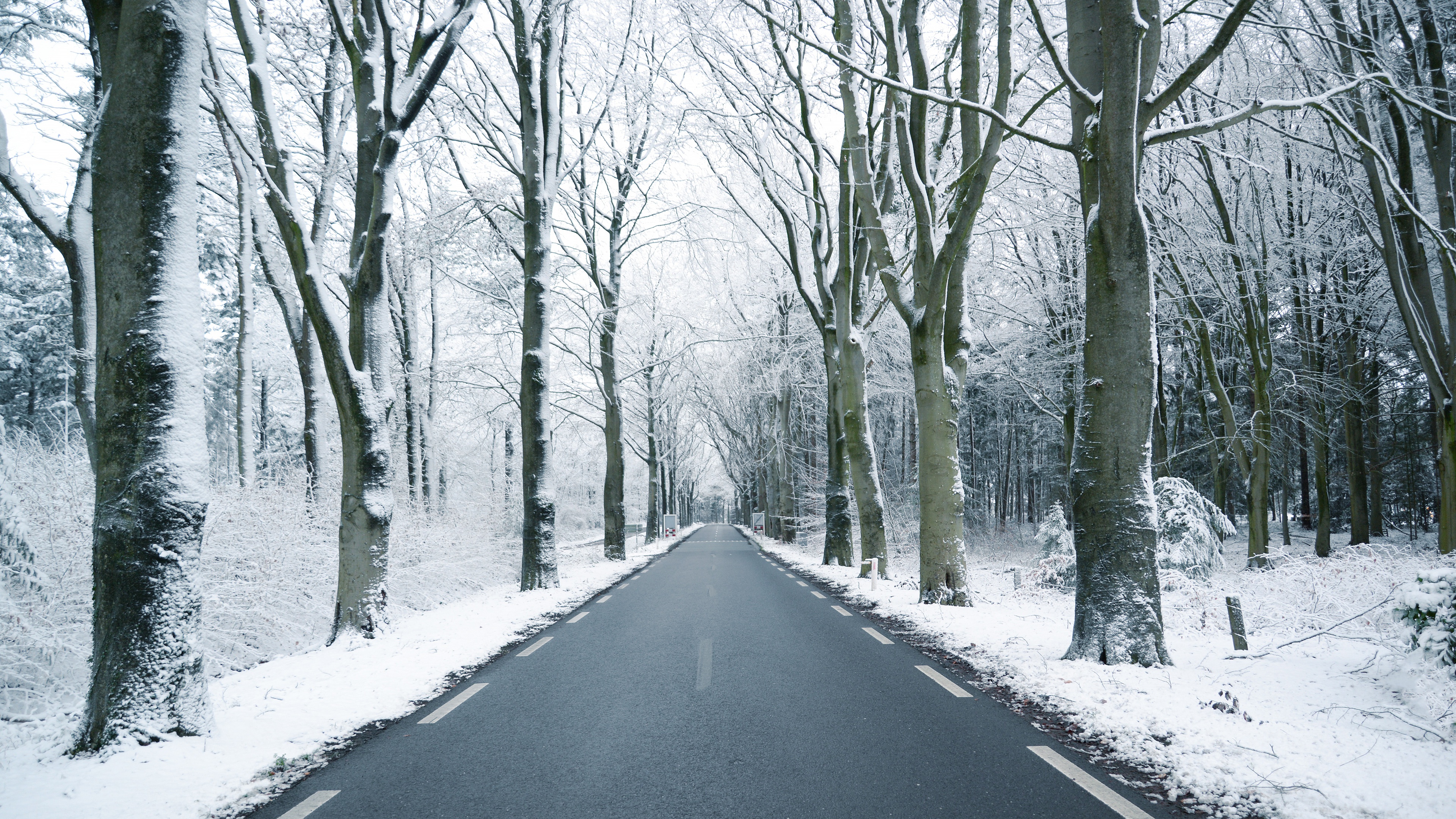 Обои Заснеженные деревья у ровной асфальтовой дороги