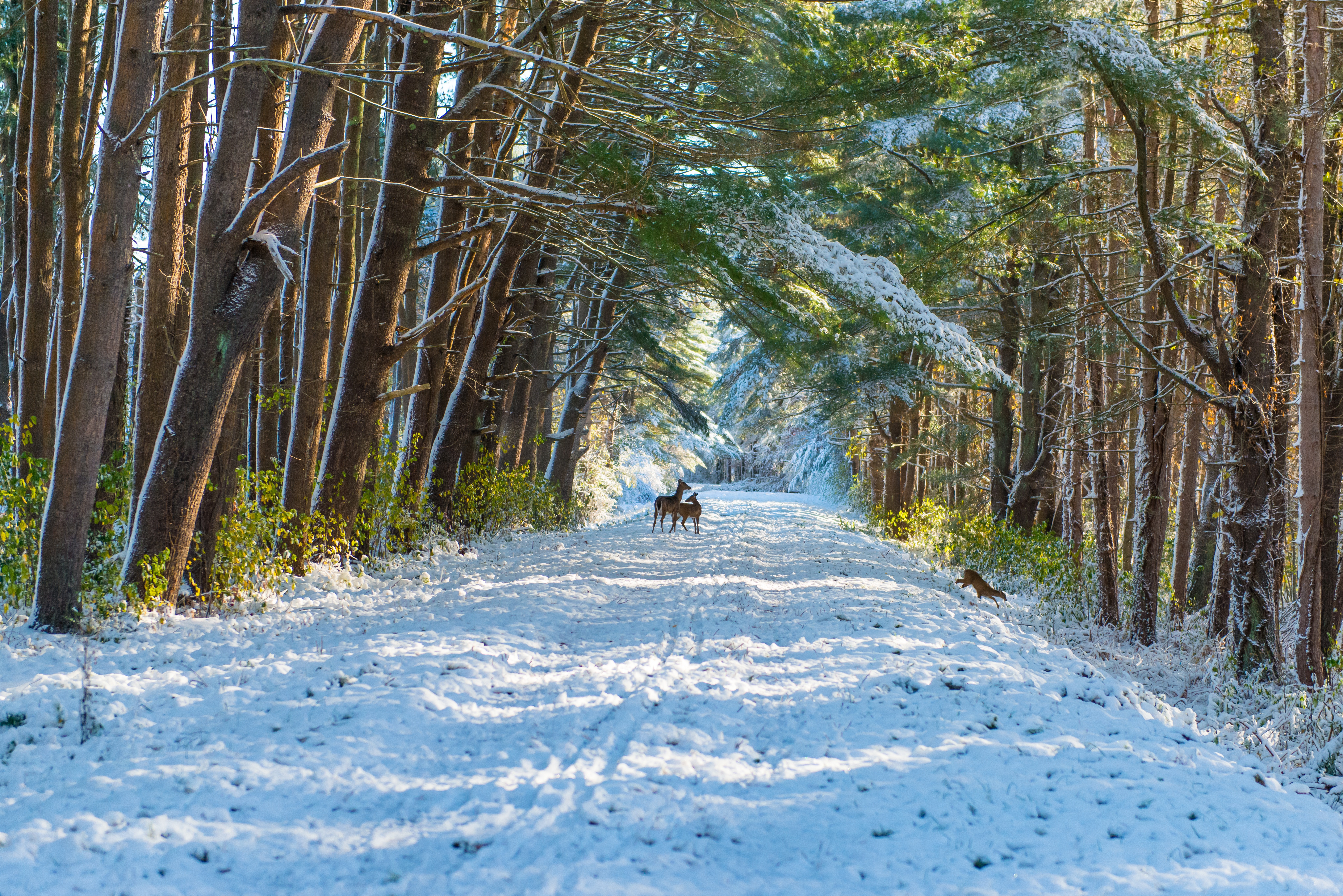 Обои Высокие деревья стоят в заснеженном лесу в лучах солнца на рассвете