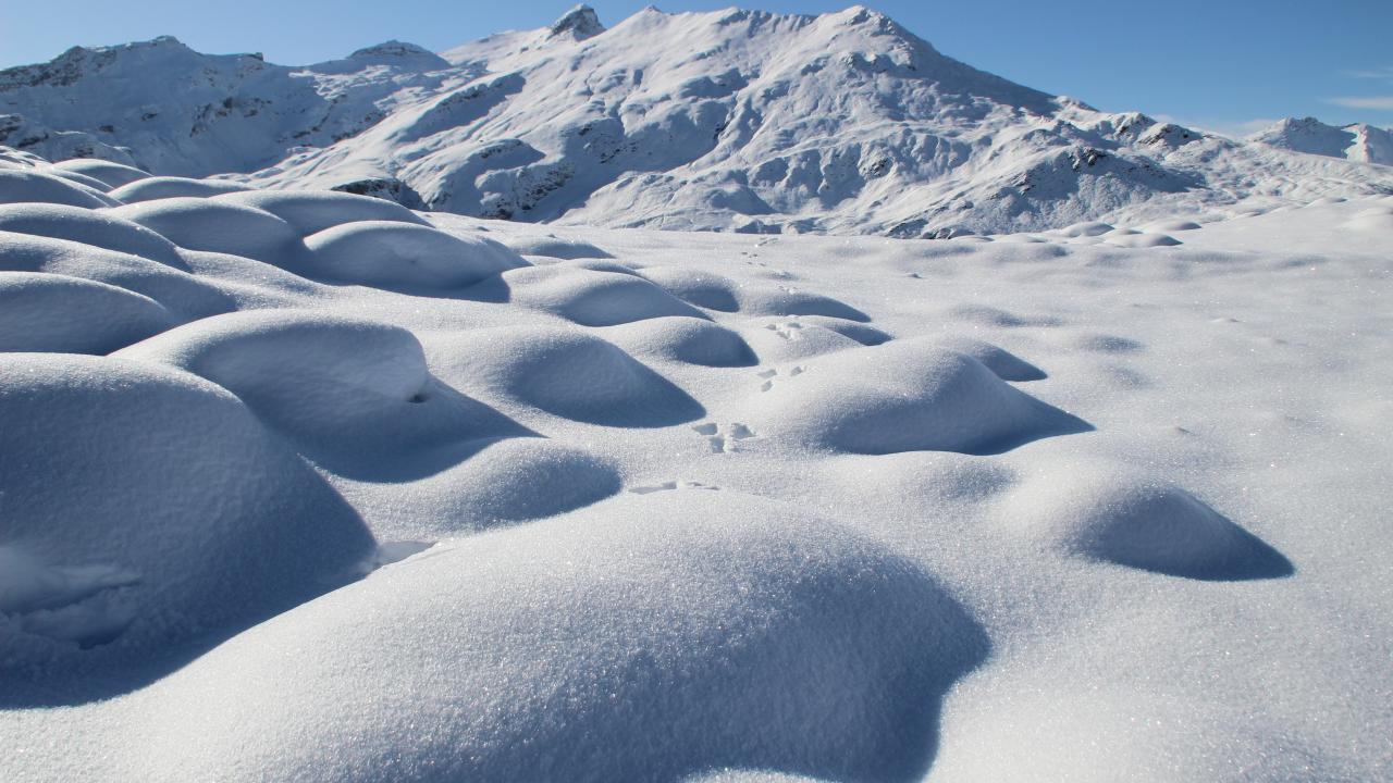 Обои Заснеженные камни на поверхности горы в лучах солнца