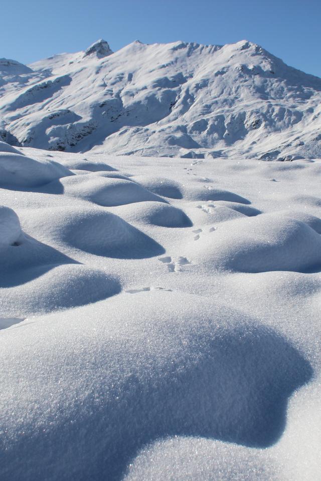 Обои Заснеженные камни на поверхности горы в лучах солнца