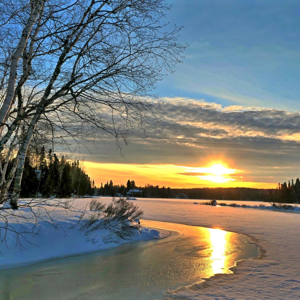 Обои Березы на берегу покрытой льдом реки на закате солнца зимой